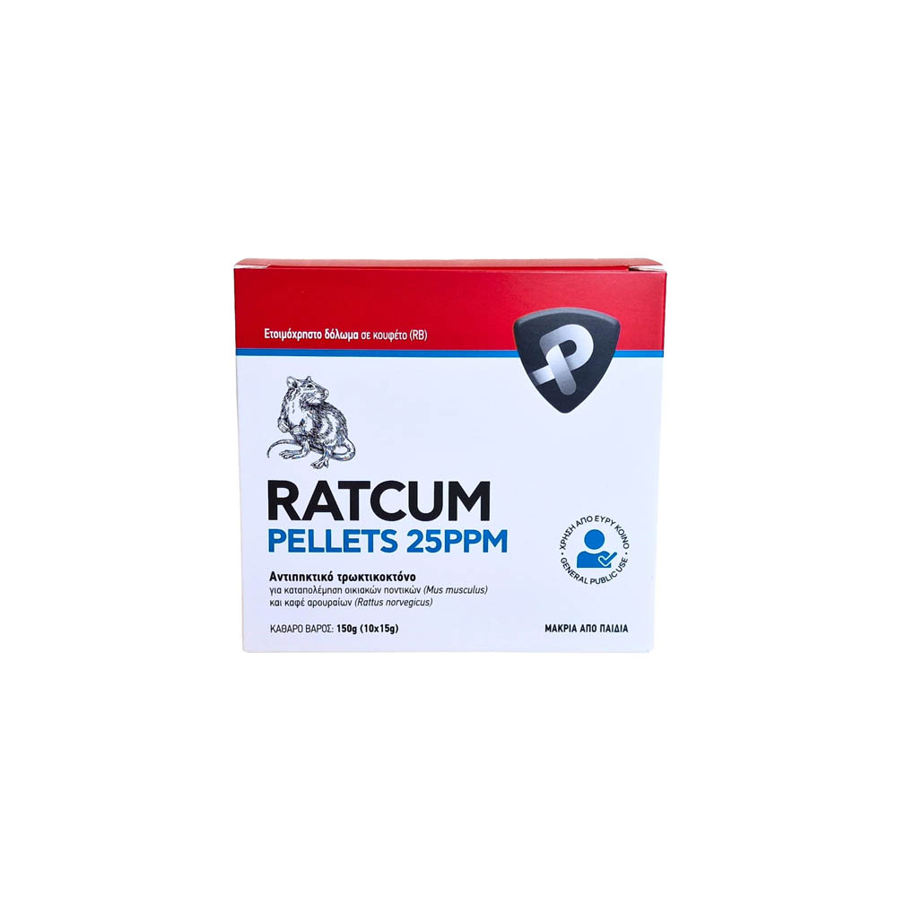 Το RATCUM PELLETS 25PPM (brodifacoum 0,0025%) είναι ένα ισχυρό αντιπηκτικό τρωκτικοκτόνο, σε μορφή pellet.