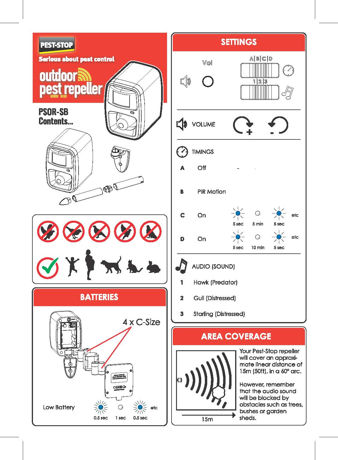 Διαθέτει επιλογή λειτουργίας είτε με χρονοδιακόπτη (εκπομπές ήχων σε σταθερά, επαναλαμβανόμενα χρονικά διαστήματα) είτε μέσω ενσωματωμένου αισθητήρα ανίχνευσης κίνησης (PIR).