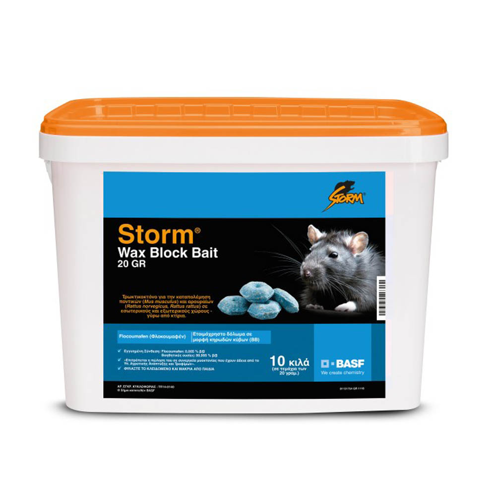 Τo STORM WAX BLOCK BAIT 20G (flocoumafen 0,005%) είναι ένα δραστικό αντιπηκτικό τρωκτικοκτόνο, σε μορφή κηρωδών δολωμάτων.